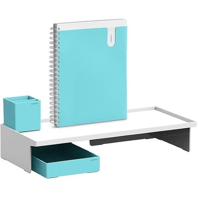 Poppin White Aqua Monitor Riser and Accessories Kit with Monitor Riser, Medium Accessory Tray, Pen Cup, 3 Subject Pocket Spiral Notebook Complete Office Accessories Set